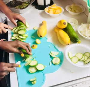 First things first, we washed our hands. Then we soaked our squash and zucchini’s, in baking soda and water for 12 minutes to remove pesticides. I had two veggie choppers on deck, 12 and 13 years old respectively. While we waited the 12 minutes I went over some rules. Like don’t taste test while we are cooking. This rule was broken almost immediately. Sigh. I went over the ingredients we would be using which involved an explanation of why pink Himalayan salt opposed to white table salt (white salt contains salt and glass and is abrasive to arteries).