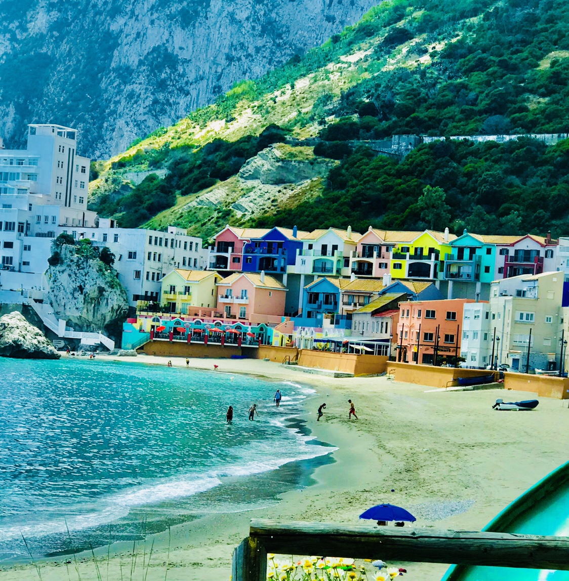 We stopped at this cozy little fisher’s village called Catalan Bay. It was so quaint and colorful. The large white building to the far left in the photo is Hotel Caleta. This is the second largest beach in Gibraltar and gets pretty crowded during the summer. It was Spring and quite chilly while we visited but that didn’t stop people from venturing into the water as seen below.