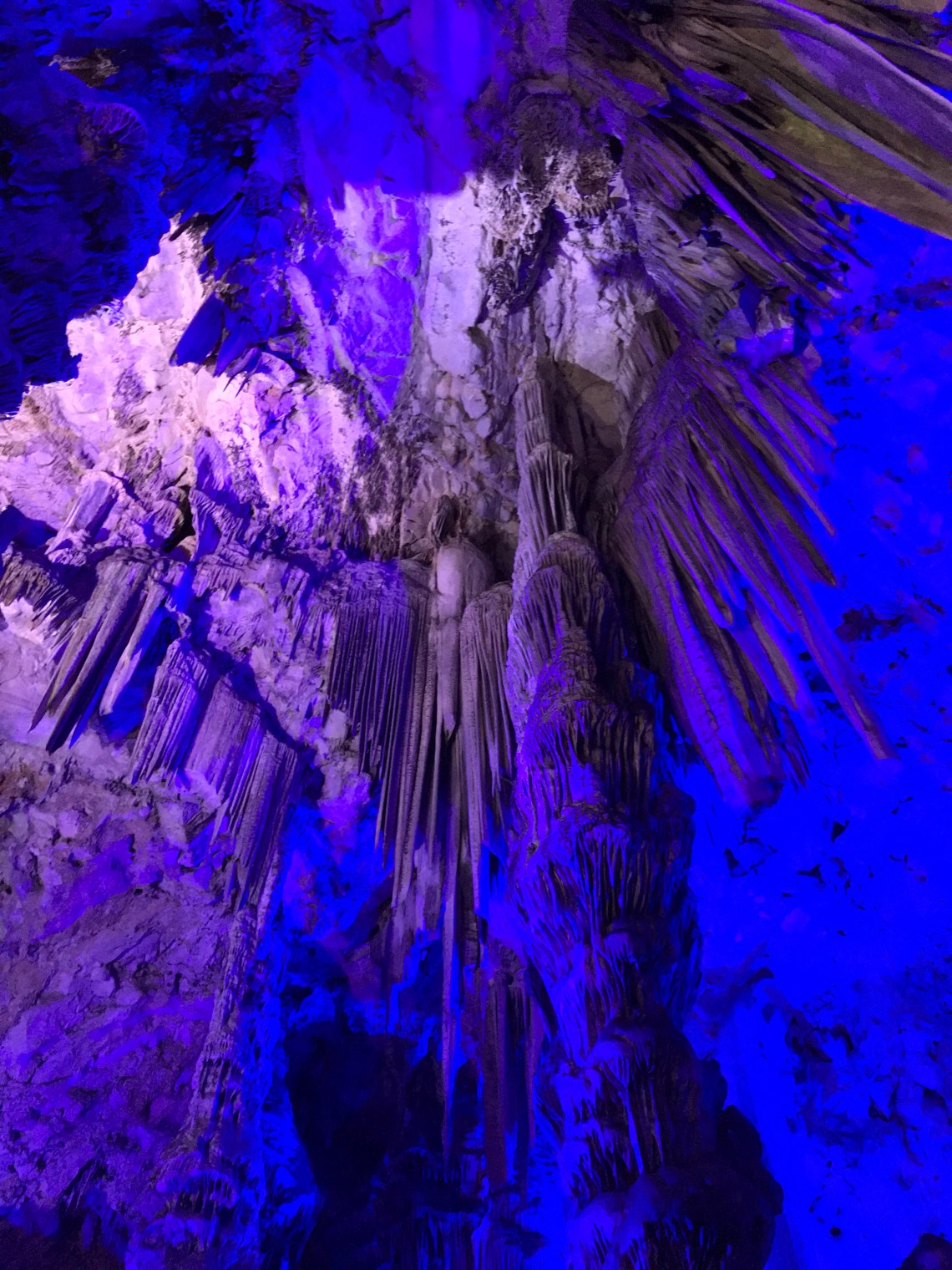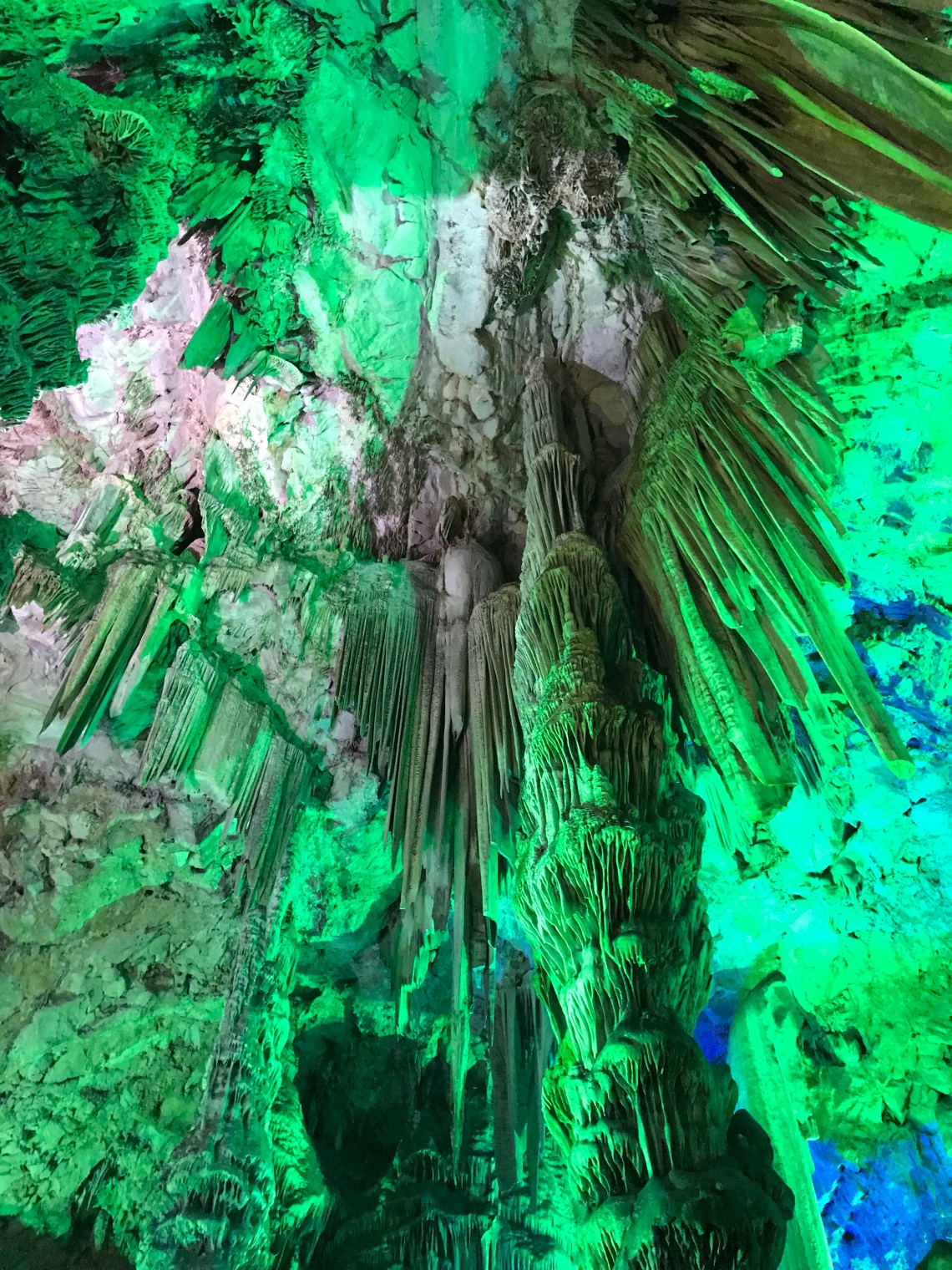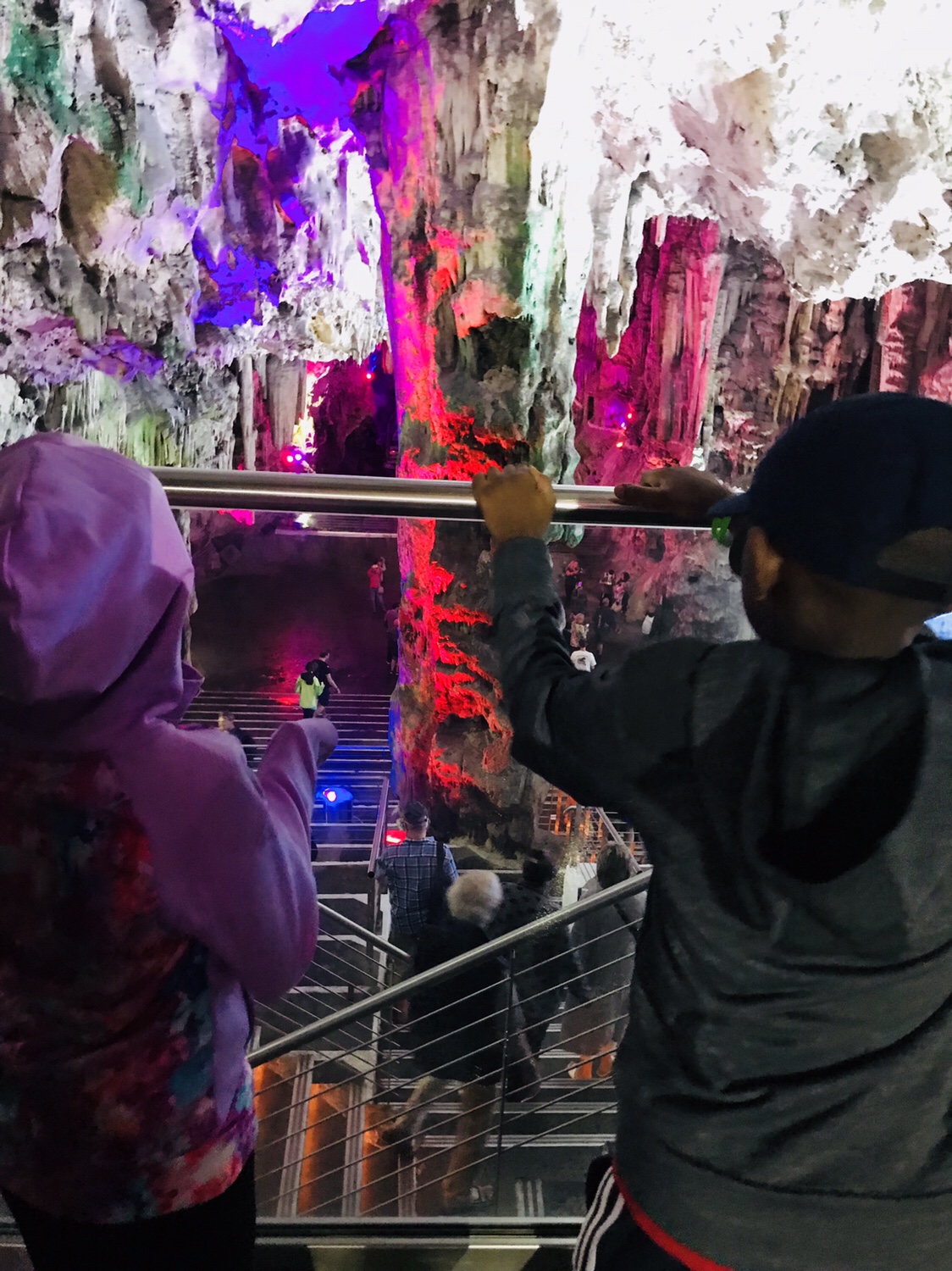 Once we exited the bus we immediately encountered the apes walking on railings and obliging photo ops with the tourists. On the way in I handed my husband some wet ones to wipe little hands if they touched the apes. He promptly shoved them in his back pocket. As we walked up the incline to enter the cave, one of the apes came running past me and towards my husband a few steps ahead of me. Next thing I heard was my husband yell,”Hey!” The ape had run behind him and snatched the wipes out of his pocket. Apparently he thought it was a snack. He ripped into it with his ape teeth, smelled the disappointment of the non-edible wipes and tossed it on the ground. Shocked and amused,we proceeded into the cave. It was quite slippery so we walked slowly and carefully. The cave was illuminated by colorful lights that highlighted each peak and crevice.